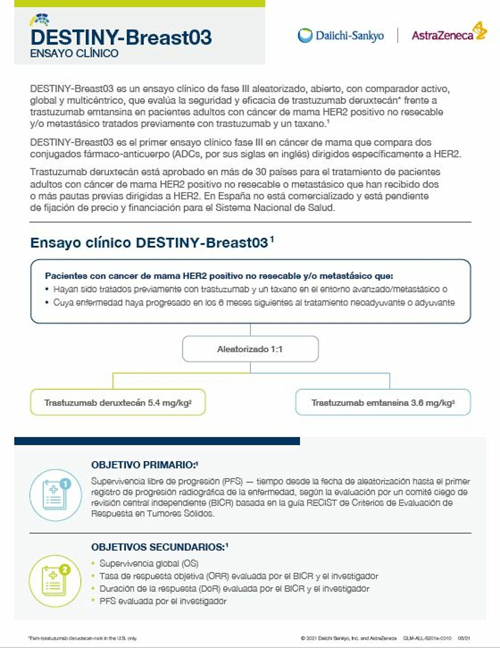 El estudio DESTINY-Breast03 es un ensayo clínico pivotal de fase III global, head-to-head, aleatorizado, abierto, para evaluar la seguridad y eficacia de ENHERTU (5,4 mg/kg) comparado con T-DM1 en pacientes con cáncer de mama HER2 positivo no resecable y/o metastásico tratados previamente con trastuzumab y un taxano. La variable principal de eficacia del estudio DESTINY-Breast03 es la SLP basada en el BICR. Las variables secundarias de eficacia incluyen la supervivencia global, TRO, duración de la respuesta, SLP basada en la evaluación del investigador y la seguridad. En el estudio DESTINY-Breast03 se han incluido 524 pacientes en diversos centros de Asia, Europa, Norteamérica, Oceanía y Sudamérica. Para obtener más información sobre el estudio, visite ClinicalTrials.gov.